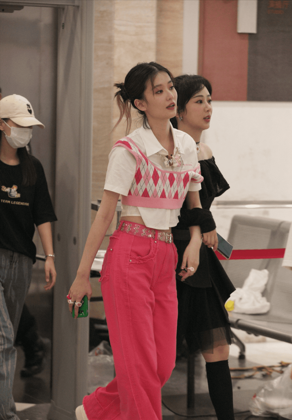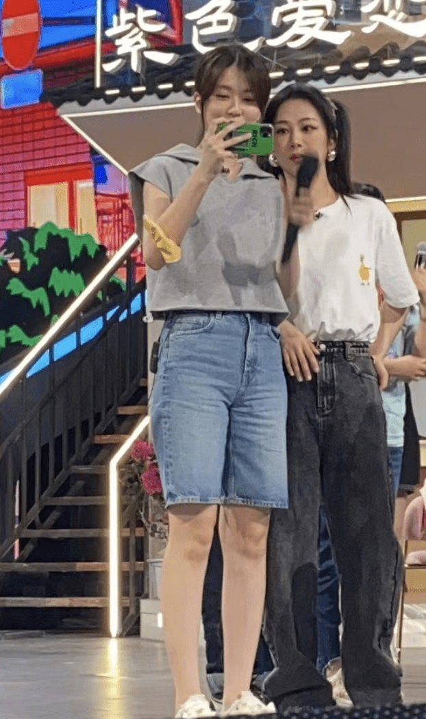 乔欣则穿着芭比粉,因为是高腰裤,所以显得身材比例格外好,而且本来个子就很高,高达172cm,所以乔欣更胜一筹。