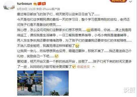 孙俪在动态中发了一长段文字,全都是关于小花和等等的。孙俪说最近每日都放飞的孩子们,明天就要结束网课开启假期生活了,表示做家长真的很不容易,孩子上课时自己网络监工,课后是孩子的生活辅导员,每日负责孩子的三餐,孩子生病又变身为健康辅导员,当两个孩子发生争吵时还得做情绪疏导,为了孩子的健康还要陪他们体能锻炼。这“哭诉”有孩子的网友都表示共情了。