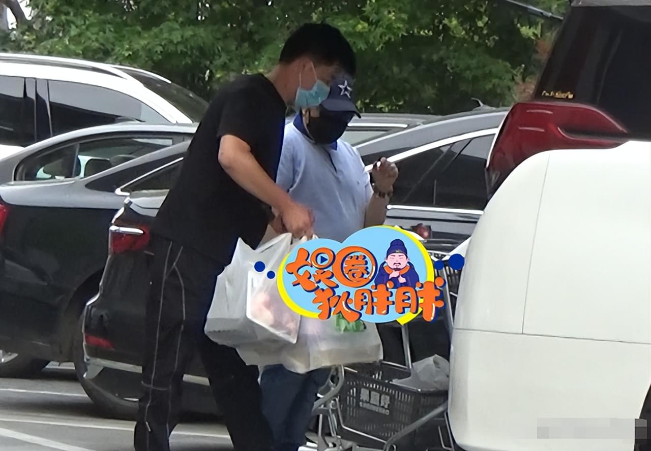 从超市出来时,司机一只手上拎着两大包食物,另一只手上还推着一个购物车。而韩红也推着一辆购物车,紧随其后。