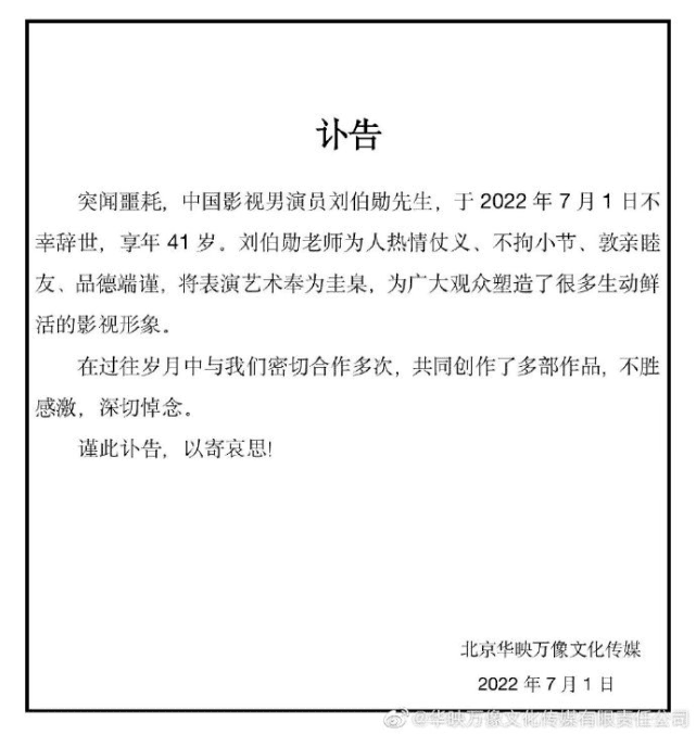 最近几天,演艺圈接连去世好几位艺人,有季东燃,李崇霄,就在7月1日,演员刘伯勋也因心梗意外离世,享年41岁。