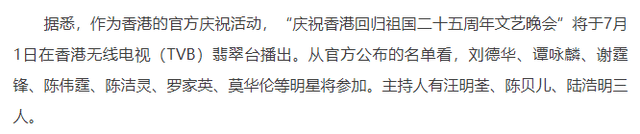 7月1日中午,央视《新闻直播间》中透露了香港回归25周年的晚会看点,引起网友关注。