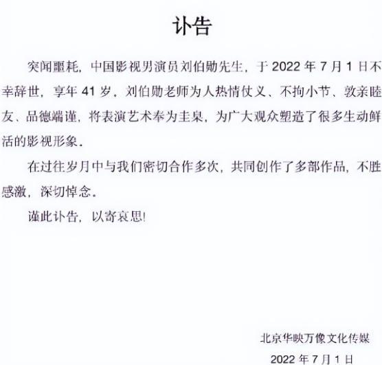 7月1日,与刘伯勋合作过的公司发布讣告,称刘伯勋老师不拘小节,为人热情仗义,为广大观众塑造了很多生动鲜活的影视形象。