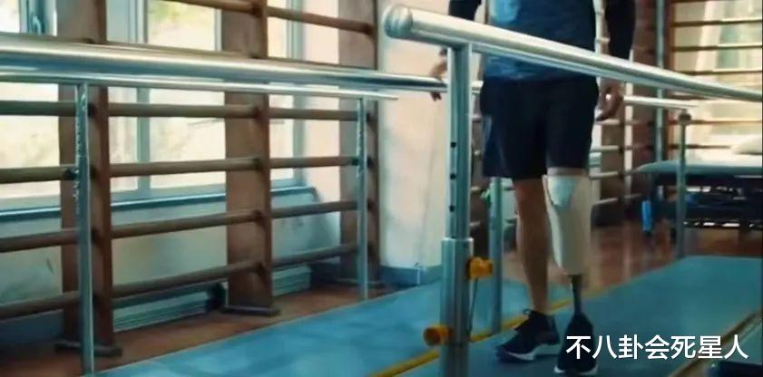 安装完毕后,他戴着假肢道具练习走路,摔倒多次还要继续,真的很敬业了。