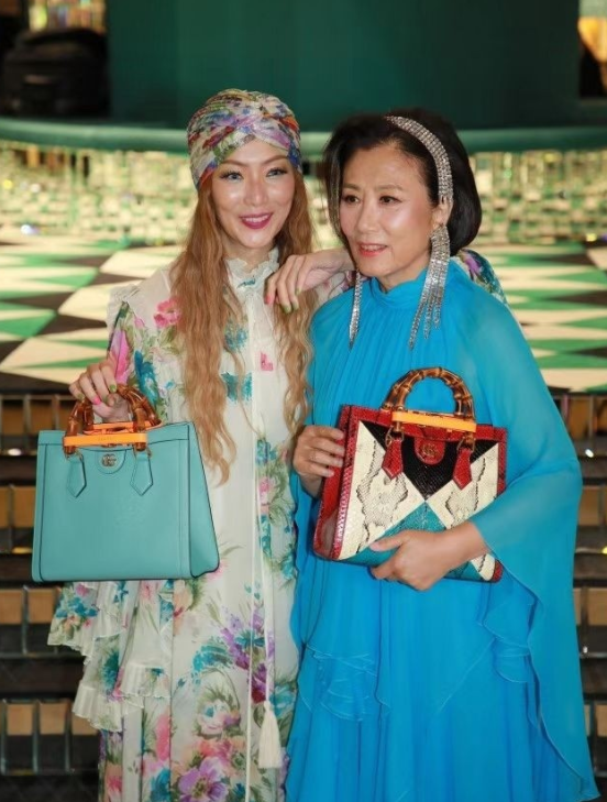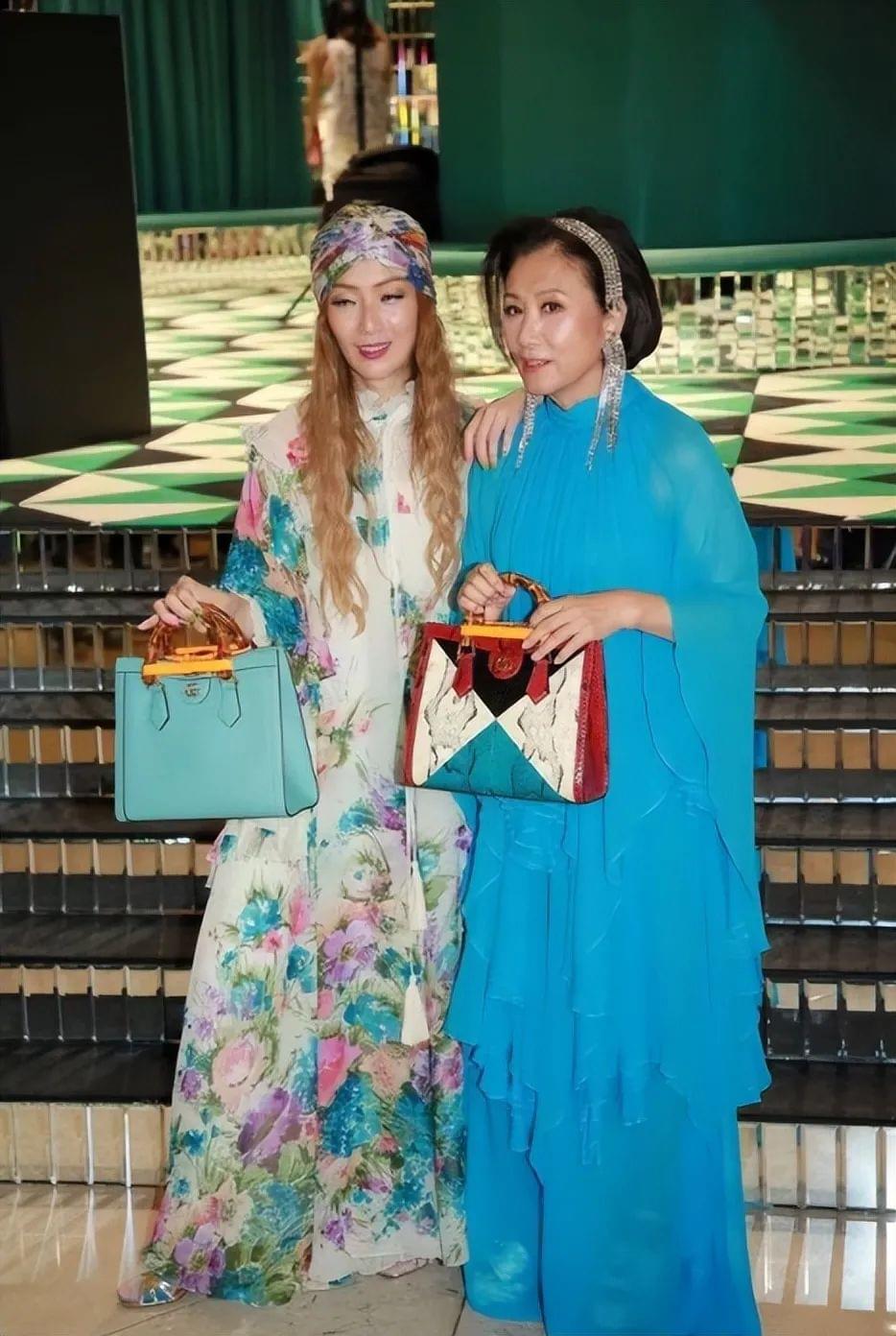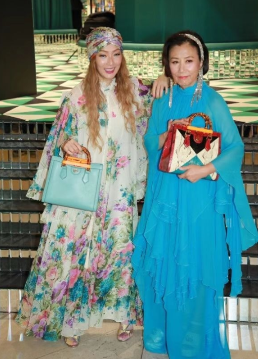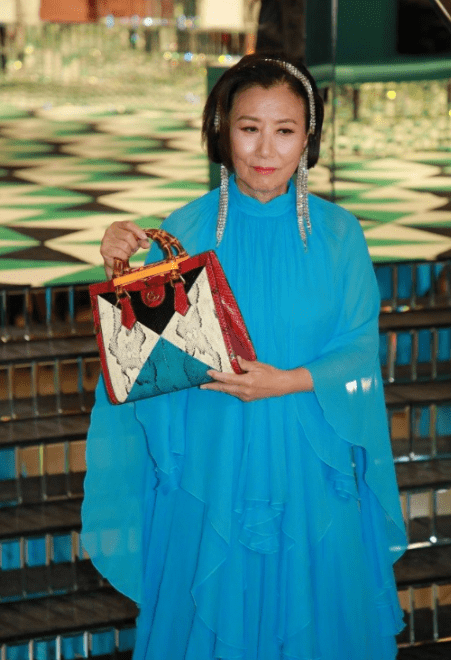 在搭配此类长款并且是纯色设计的裙装时,为了避免造型显得单调乏味,大家可以像汪明荃这样巧用个性配饰来提升造型感。拼色包包设计感十分别致,竹节手柄搭配上四四方方的包型为造型增添了几分东方复古的高贵优雅,进一步提升了成熟女性的优雅气质。
