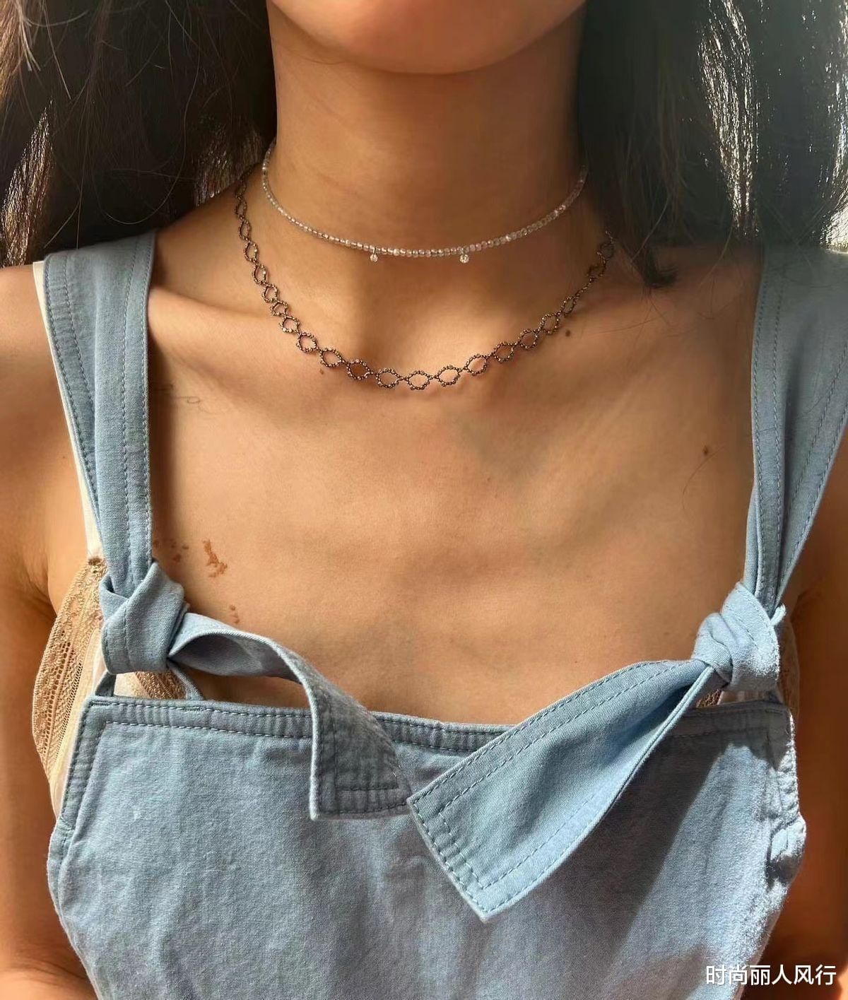 Tips:对于大面积的露出脖颈线条的穿搭方式来说,为了更好的强调修饰效果,配饰尤其是项链的点缀很重要,基础款的项链叠戴,不仅可以强调修身效果,也可以凸显造型的时尚感觉。