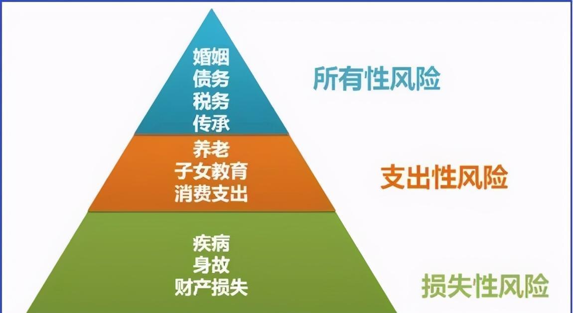 风险金字塔,一般分为三层,分别是:损失性风险、支出性风险和所有性风险。