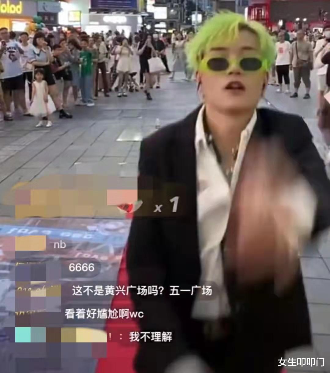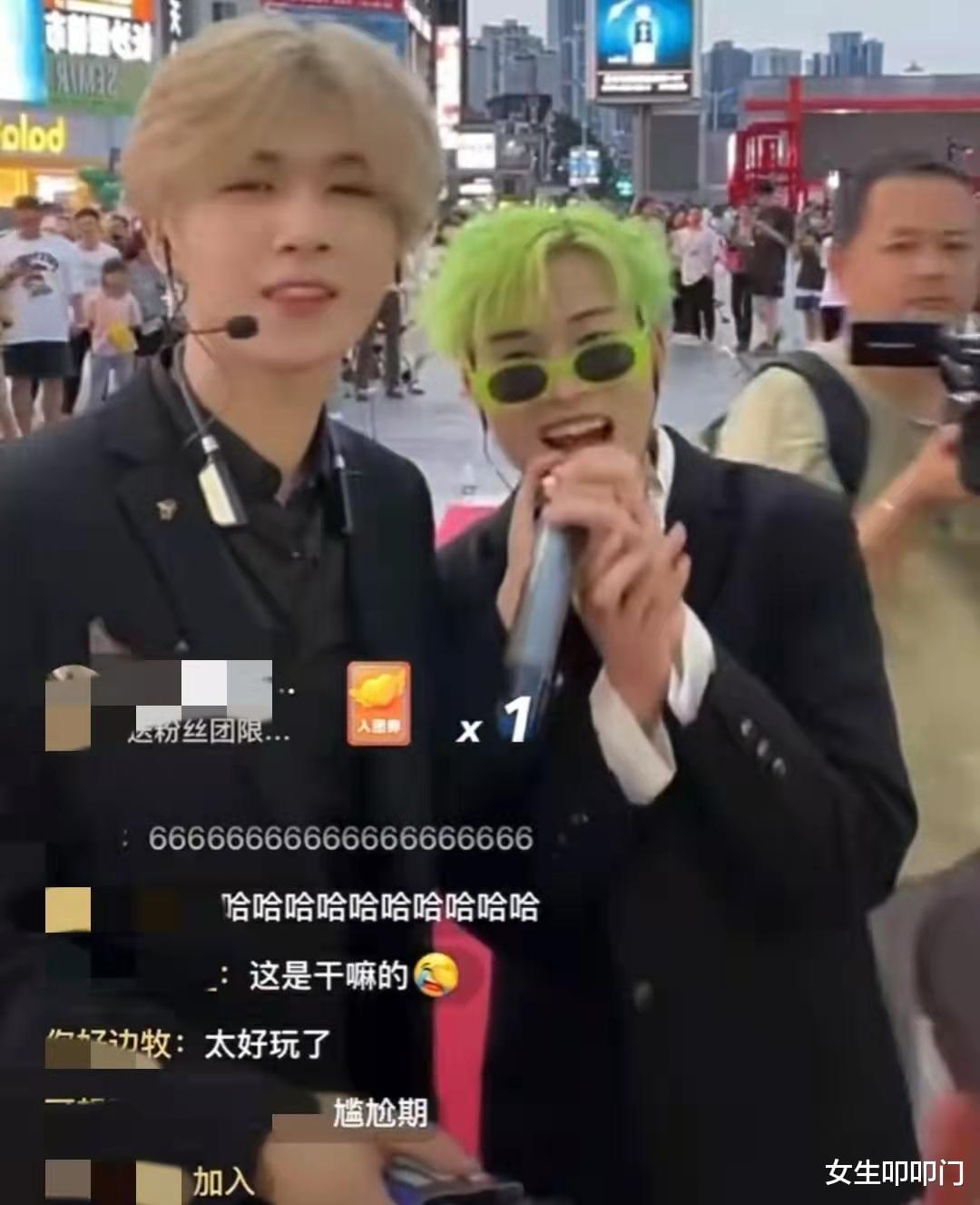 第二位上场的成员是权酷龙,他留着绿色的头发,戴着绿色边框的墨镜,边入场还边手舞足蹈,看得出来特别兴奋。从直播背景可以看出他们为了出道直播十分用心,还在地上铺了红毯。