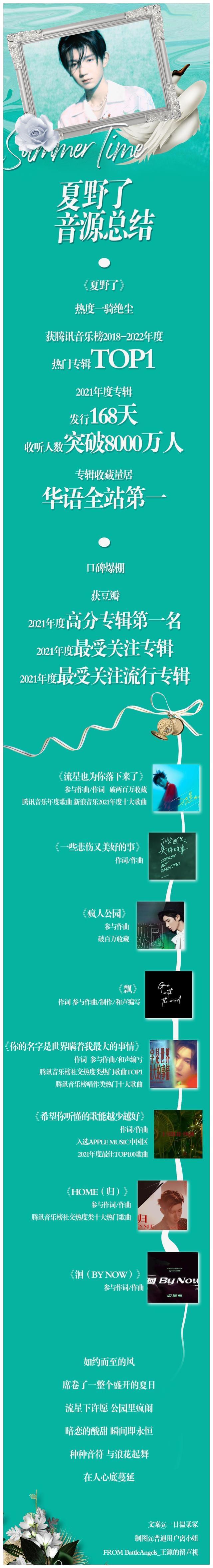 作品成绩《夏野了》热度一骑绝尘,荣获腾讯音乐榜2018~2022年度热门专辑TOP1;2021年度专辑,发行168天,新歌收听人数突破8000万人,专辑收藏量居华语全站第一。2022限定minilive《橘色天际线》经验破圈,引爆全网,72小时预约人数超300万人,30分钟演唱会观看超过2000万人,微信指数突破一亿八千万。