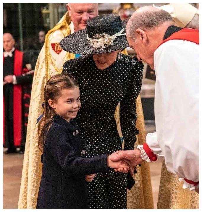 这是迄今为止,女王曾孙辈们出席过的最重要活动。乔治和夏洛特着装与威廉保持一致,选择藏青色,凯特王妃穿黑底白点波点裙,戴黑色宽檐草帽。爹妈一人带一个,确保不出错。乔治穿正装,圆脸蛋还是有点呆萌;夏洛特穿Amlia大衣,梳漂亮的编发,气质沉稳,看上去比实际年龄更成熟