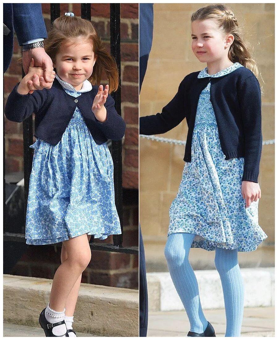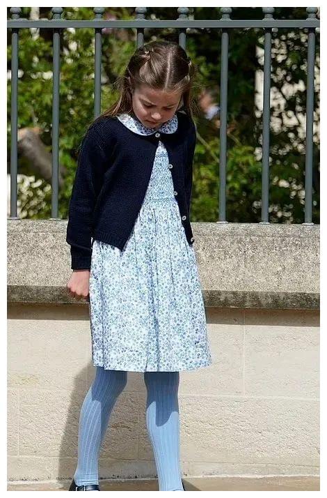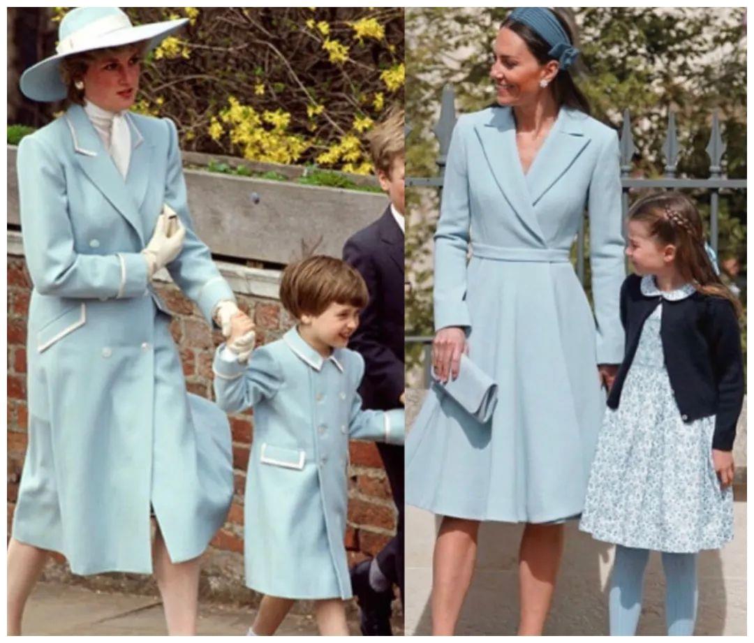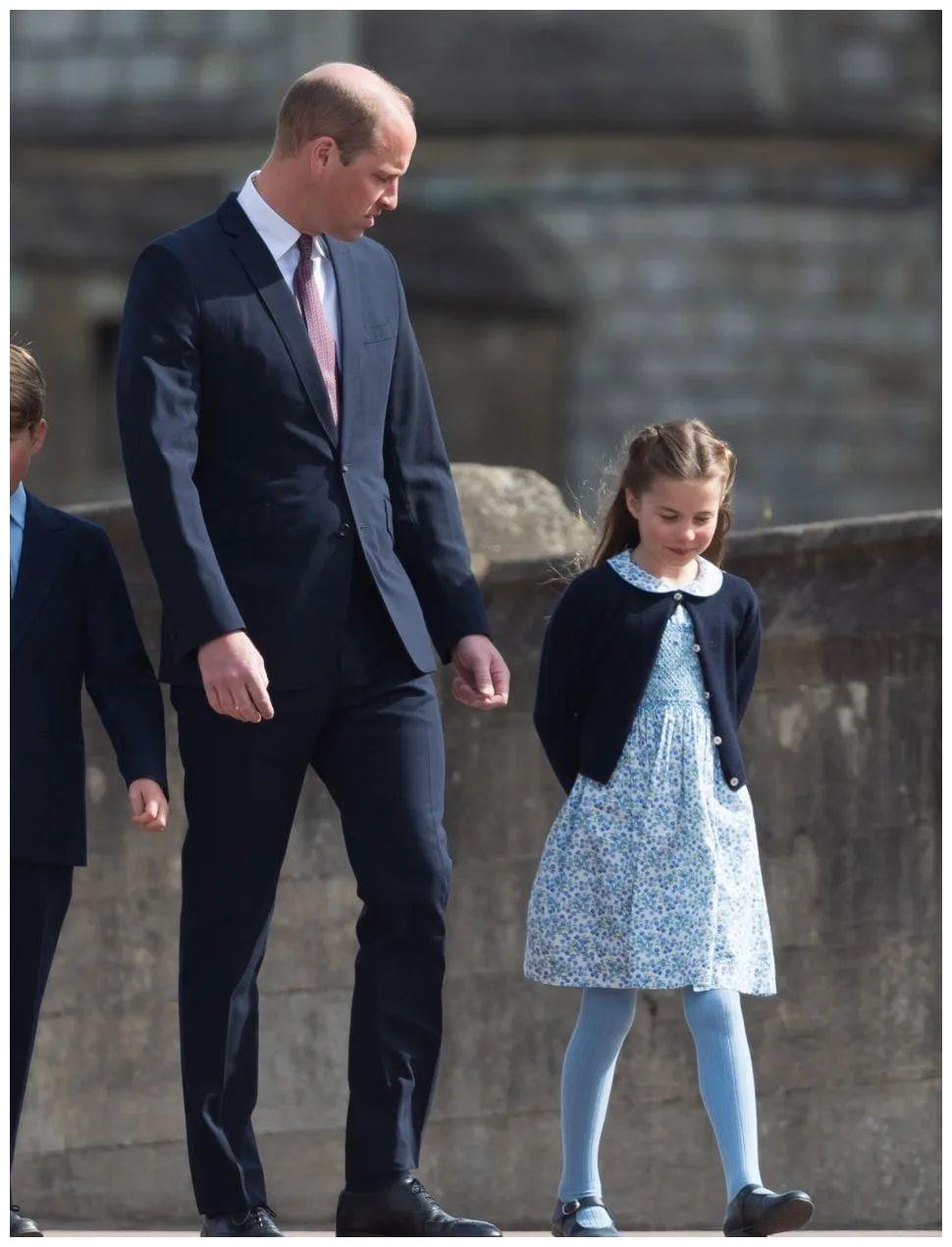 夏洛特落落大方,穿着与凯特顺色的浅蓝碎花裙和裤袜,像极了戴妃威廉早年的亲子装