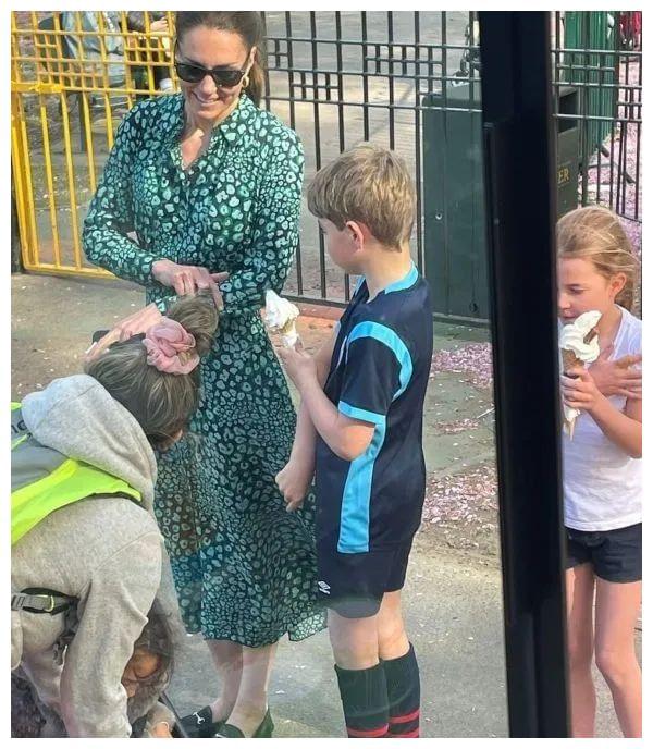 近日,凯特带孩子们在路边自由自在吃冰淇淋,她戴墨镜,穿绿色豹纹的长袖连衣裙,穿黑色平底鞋,满脸笑意。