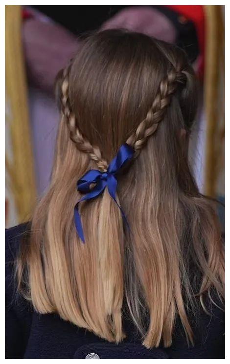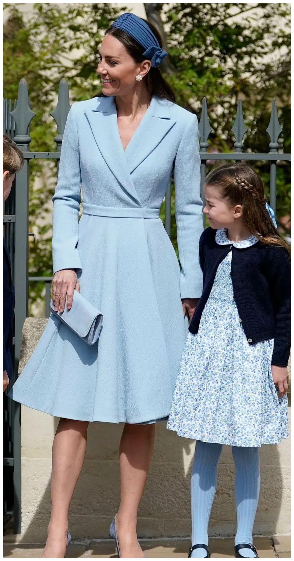 凯特打造亲子造型,穿浅蓝EmiliaWickstead外套裙,搭配深蓝JaneTaylor钻石皱褶发带。夏洛特风格跟小时候差不多,针织衫内搭约千元rmb碎花裙,配蓝色连裤袜