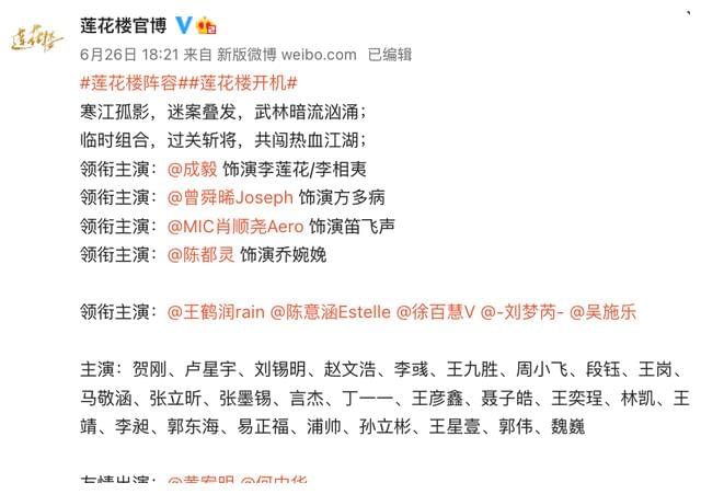 这部剧3月28日开机,已经拍摄了三个月了,一般电视剧的拍摄周期就是三个月左右,但是,这部剧因为是72集的体量,应该拍摄周期会更长一点。剧情改编自桐华的同名小说,取材于《山海经》,讲述西陵珩的女儿小夭与表哥轩辕玱玹、涂山世家公子涂山璟、神农义军将领相柳之间的恩怨情仇。设定特别之处是女主的官配不是男主,估计得扎不少观众的心。网上爆出了不少路透图,主角们的造型都很养眼。莲花楼主演:成毅、曾舜晞、肖顺尧、陈都灵、王鹤润、陈意涵、徐百慧、刘梦芮、吴施乐这部剧6月26日才官宣开机并公布了全阵容,“熟人”非常多。