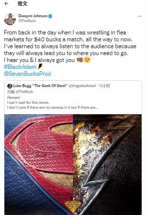其实不仅仅是我,有一大批DC的粉丝希望超人会客串这部电影。随着《黑亚当》即将上映,一位等待着电影的粉丝,他发了一条文章说道自己非常希望能够看到超人和黑亚当同时出现在《黑亚当》这部电影中。巨石强森也看到了这篇文章,他回应了一句非常鼓舞人心的话。在这位粉丝下方,巨石强森留言说道:“我学会了倾听观众的声音,因为他们总是会把你带到你需要去的地方。我听到你的声音了,我懂你。”
