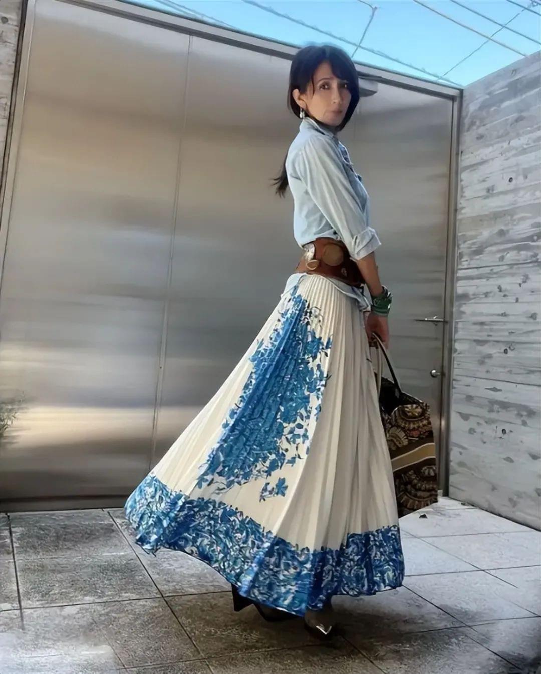 繁简结合是一个十分实用的搭配原则,单穿一件淡蓝色衬衫,虽说文艺清爽又耐看,但是纯色设计难免会让人感觉单调。这个时候搭配一件印花百褶裙就刚刚好,百褶裙中的蓝色印花元素与上衣的淡蓝色属于同一色系,上下呼应的配色能够提升造型完成度,‘上简下繁’的组合高级又耐看,很有文艺女神既视感。