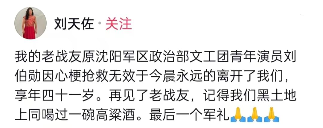 演员刘天佐与刘伯勋曾是同一文工团的战友,他在社交平台上发文透露好友于7月1日早晨因心梗抢救无效去世,并十分悲痛地表示:“再见了老战友。”