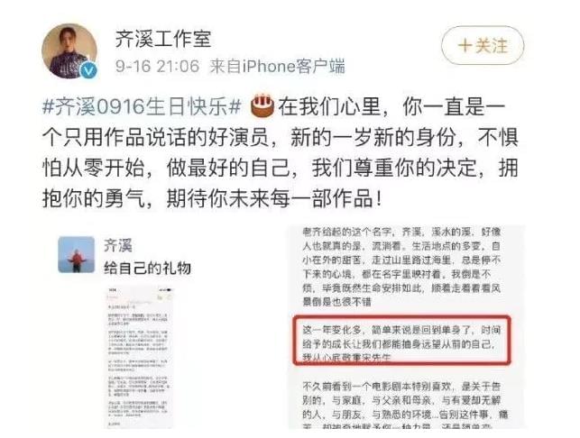 接着,同年九月份,齐溪在自己生日那天来了个说明,说自己离婚了。