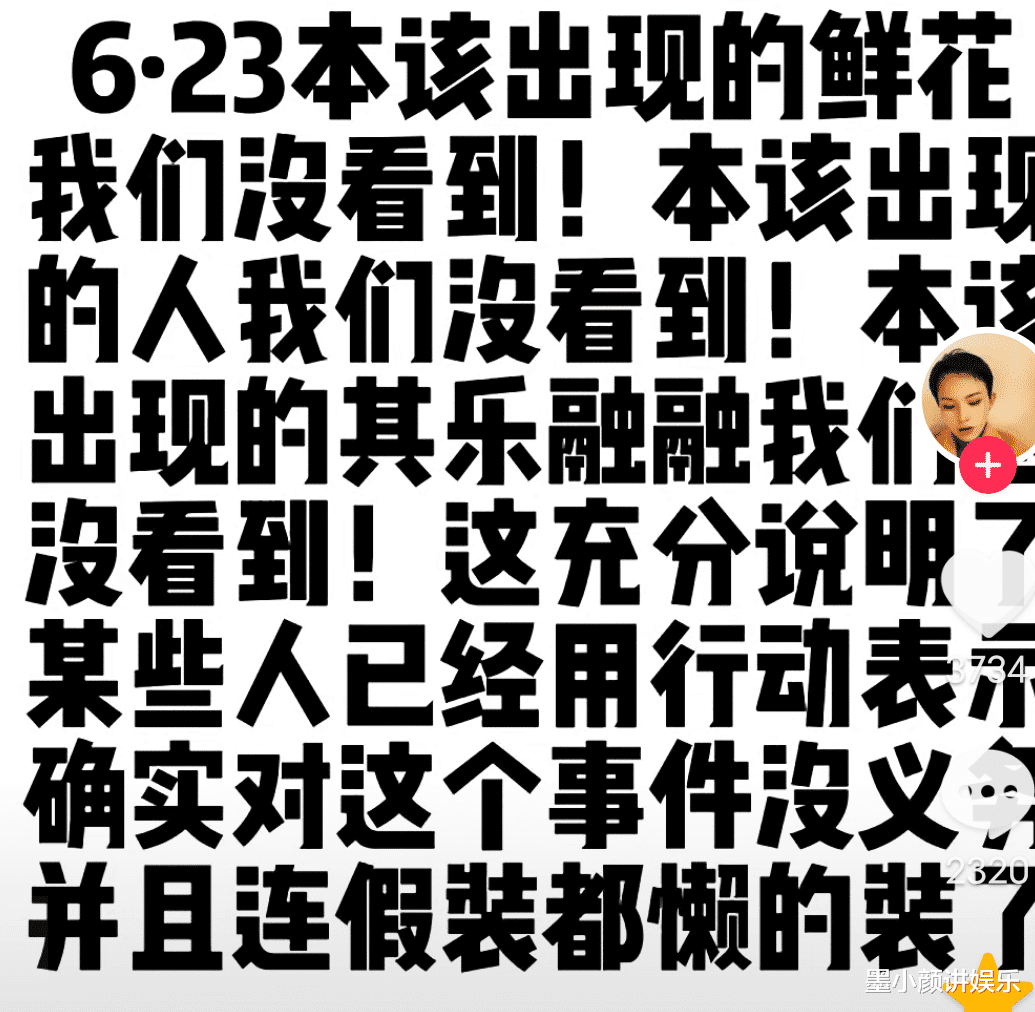 二审庭审已经过去有几天了,错换的热度也在渐渐褪去,这个时候大王又把田静和郭威拉了出来,大王表示6·23本该出现的鲜花我们没看到,本该出现的人我们没看到,本该出现的其乐融融我们没看到,这充分说明了某些人对这件事情已经没义务并且连假装都懒得装了。