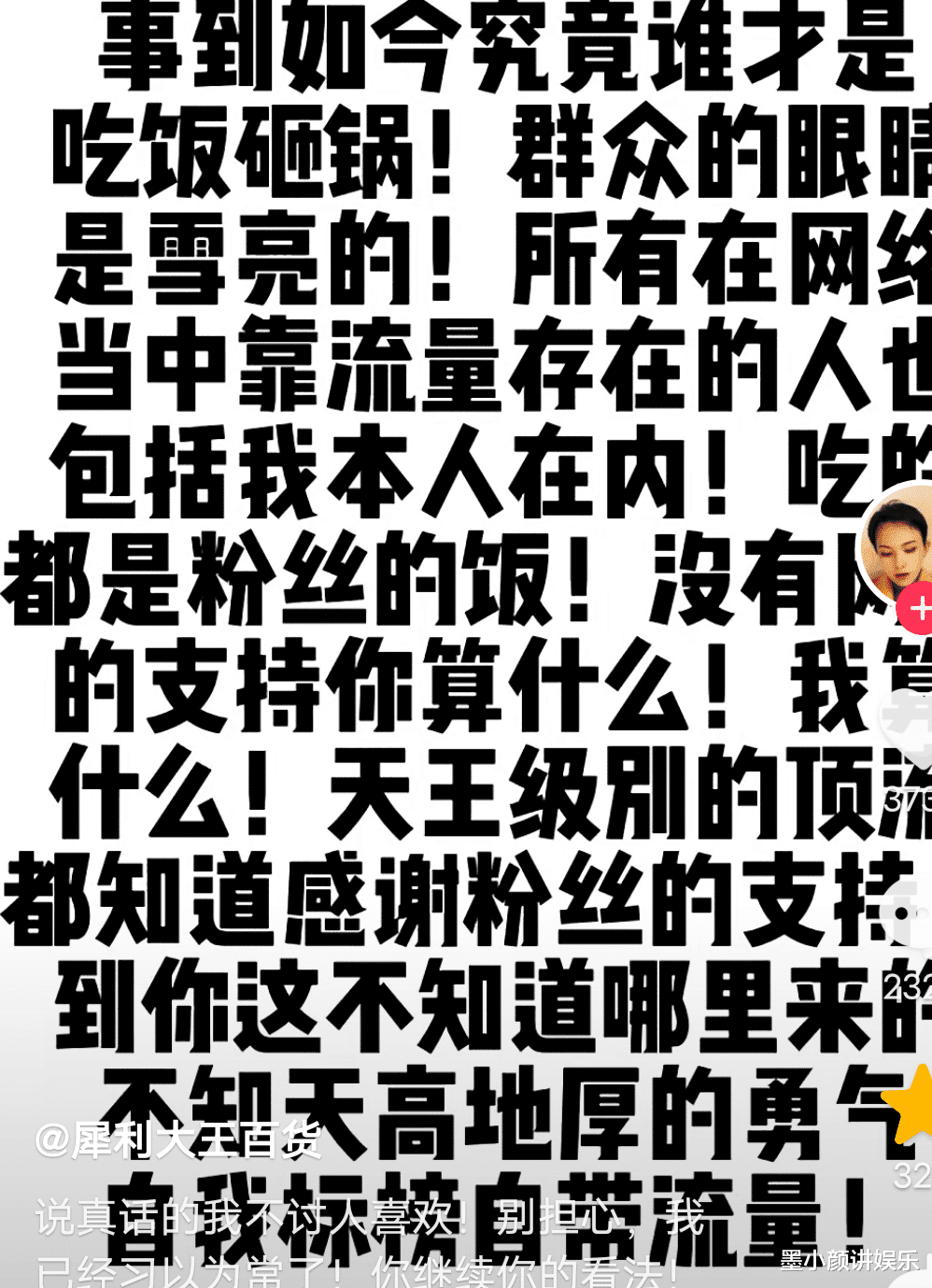 大王还表示所有在网络靠流量赚钱的人,包括我吃的都是粉丝的饭,没有粉丝你算什么,真不知道你哪里来的勇气不知天高地厚的自带流量。