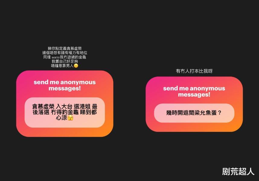 梁允瑜日前在IG发起匿名问答活动,有网友酸她:「爱慕虚荣进大电视台,选港姐最后落选,没钓到金龟婿,看了心都凉了」,对此,她也回答:「这要看你怎么定义爱慕虚荣,谁不想有钱有权有地位,我没钓过金龟婿,我靠自己就够,不喜欢靠男人」。