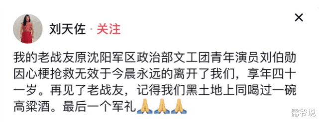在得知刘伯勋去世的消息后,好友以及战友刘天佐为他献上军礼送别,他发文称「我的老战友刘伯勋因心梗抢救无效于今晨永远地离开了我们,享年四十一岁。再见了老战友,记得我们黑土地上同喝过一碗高粱酒」,言语之间满含对故人的思念。刘天佐与刘伯勋曾是同一文工团的战友,所以刘天佐才会称他是老战友。