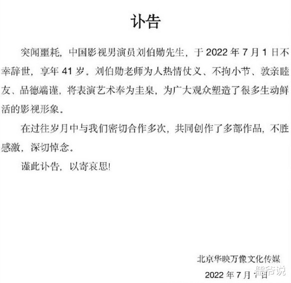 世事无常,人的生命,看似坚强,实则非常脆弱,待死神降临的那一刻,无论是亿万富翁还是明星大腕,谁都无法逃脱,宝贵的生命瞬间即逝。2022年7月1日,娱乐圈传来噩耗,知名演员刘伯勋因突发心肌梗塞抢救无效去世了,年仅41岁。