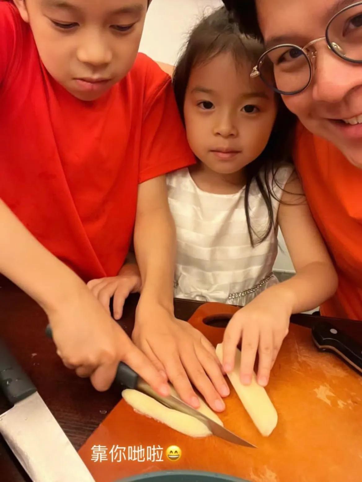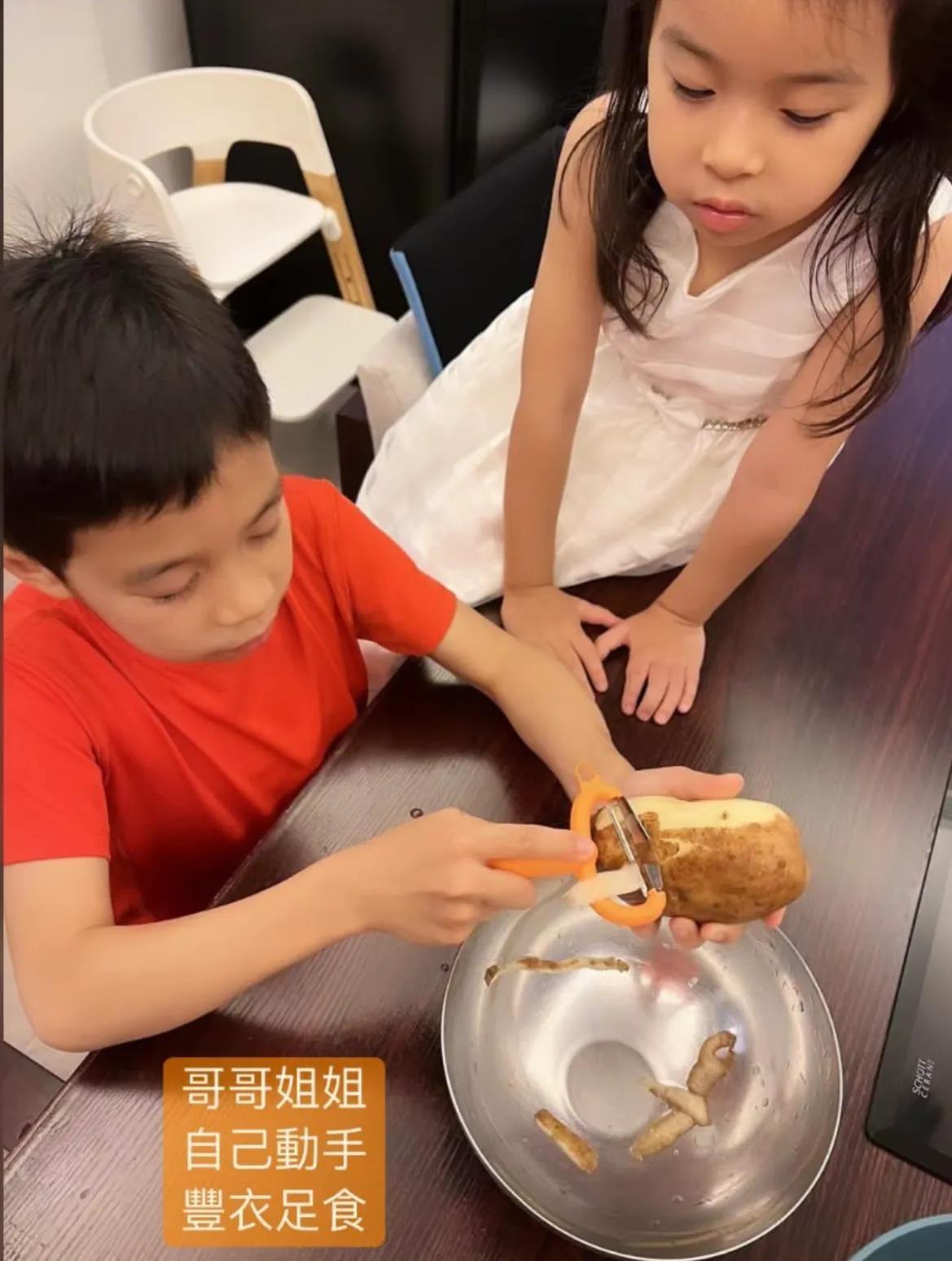 霍启刚和小女儿把马铃薯买回来后,8岁的大儿子霍中曦和二女儿霍中妍就开始负责动手做薯条。看霍中曦熟练的削皮动作就知道不是第一次做了,看来平时也有帮家里做家务呀,不愧是有担当的哥哥。有哥哥在忙活,妹妹霍中妍想帮忙都没机会,只好在旁边看着学习。