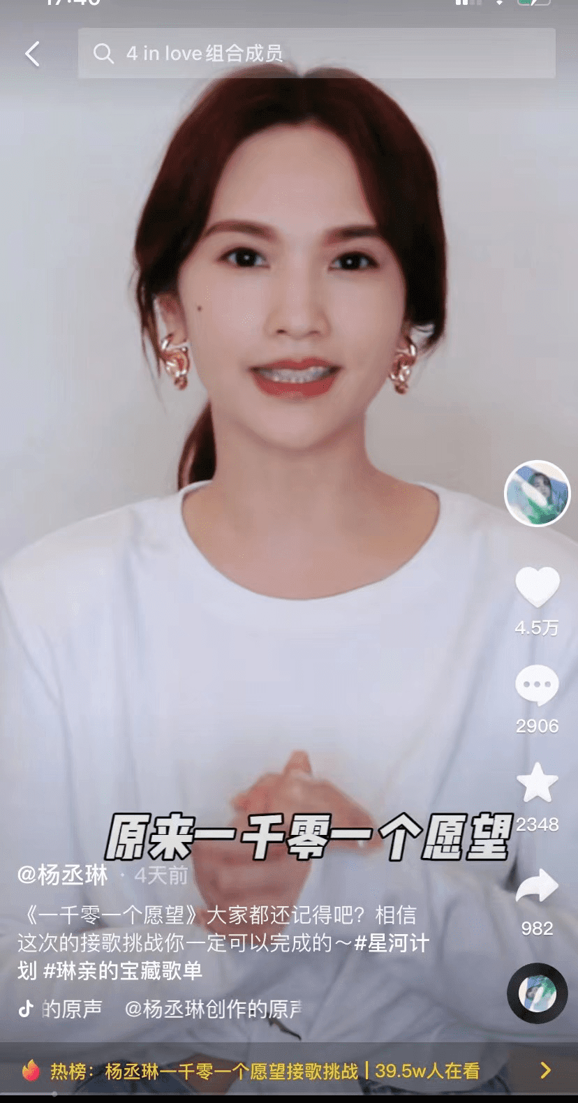 近日,杨丞琳在各平台发起合唱挑战,多首脍炙人口的歌曲再度演绎,邀请接歌。无论是粤语歌曲《甘心替代你》还是《一千零一个愿望》、《青春住了谁》,每一首歌曲都是很多人的青春回忆。不少网友也在评论中提到想听到更多的接歌挑战,比如《年轮说》、《暧昧》等经典歌曲。