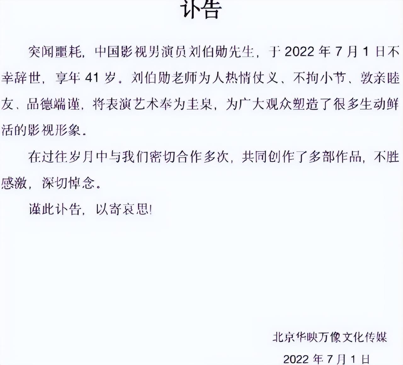7月第一天(1),青年演员刘伯勋惊传猝死噩耗,年仅41岁,令人惋惜!据逝者生前所属经纪公司“北京华映万象文化传媒”发布的讣告得悉,刘伯勋因突发心梗于7月1日凌晨送医抢救无效不幸离世,独留孤儿寡母在人间。因当地正值特殊时期,经家属同意,丧事一切从简。