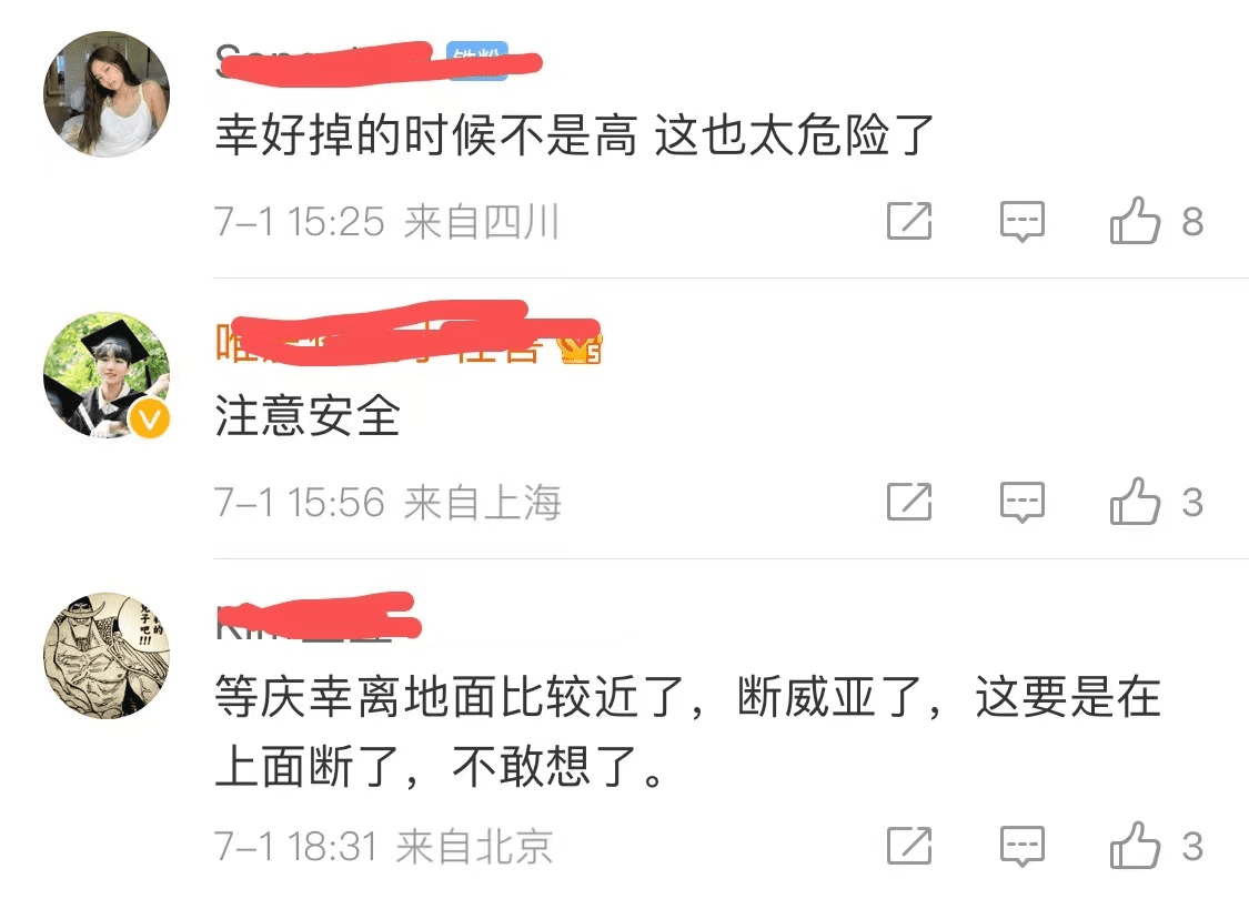 节目播出后,许多网友也被这个失误片段所震惊,纷纷在评论区留言表示:“这也太危险了吧"、”这摔下来一定很痛啊“、”庆幸这时候离地面比较近,要是在上面断了,不敢想“,也有人特地去安慰女星黄奕,”虽然有点小失误,但还是很棒“、”努力过就好啦,结果不那么重要“、”已经很棒啦“。