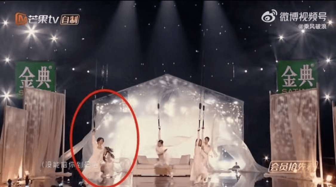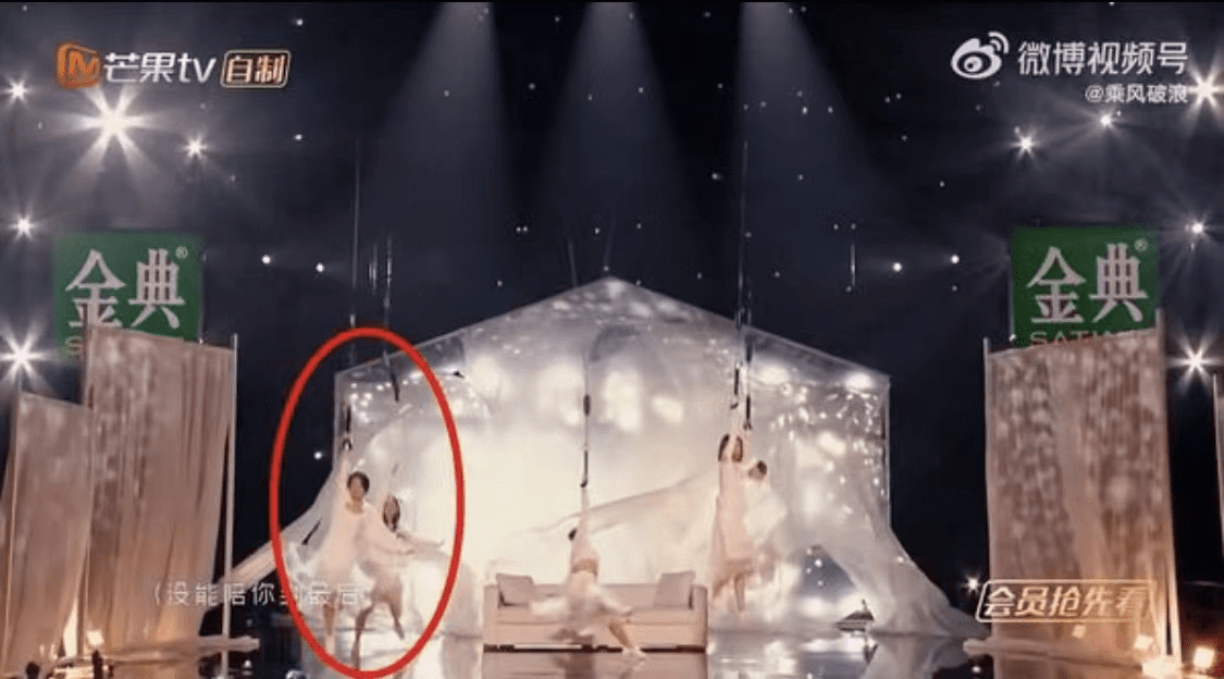 而女星黄奕疑似因为没有抓牢,在降落过程中失手坠落,所幸当时高度离地面不远,她虽然没能站稳、自己差点跌坐在地上,但最后还是稳住了身体,没有造成伤势。不过,等她站稳之后想要重新握住钢丝进行表演,却发现已经落了节拍无法跟上,导致舞台表演出现严重失误。