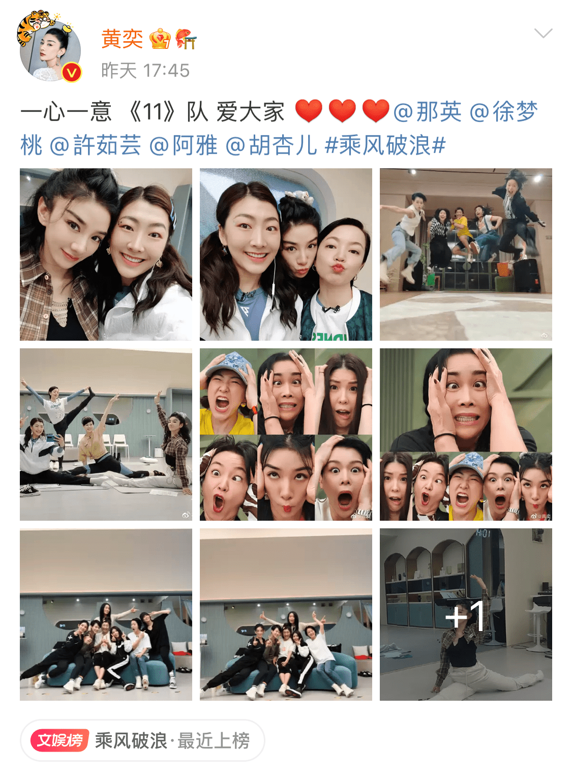 今早黄奕也晒出与小组姐姐们排练时的合照,说道:“一心一意《11》队爱大家”。虽然第三次公演结果显示黄奕和队员阿雅惨遭淘汰,不过姐姐们在节目中的努力表现仍获得观众们的点赞和好评。