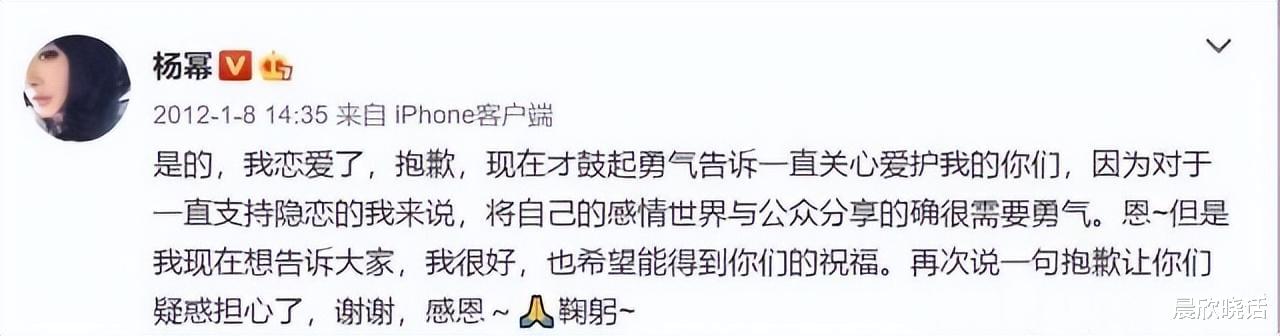 2012年,杨幂和刘恺威同进同出已经被多次拍到,于是两人在发微博大胆认爱。他俩也是第一对用微博官宣恋情的明星CP。