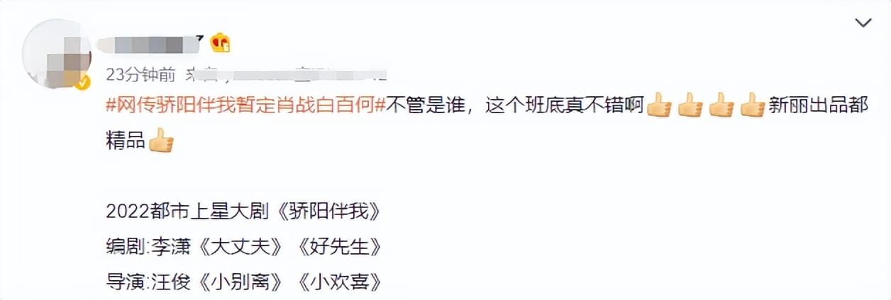 眼下,网传又一部姐弟恋大剧《骄阳伴我》筹拍,预计8月开机,男主拟定肖战,班底质量不俗,难道是要大爆了?