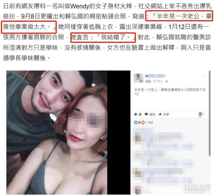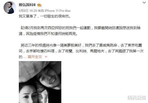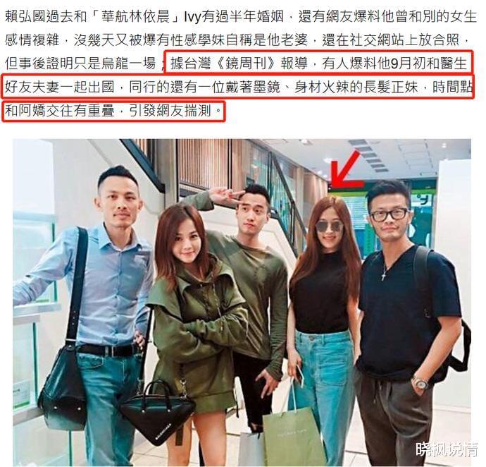 阿娇朋友在采访中,也指出了这点—— “赖弘国婚后仍与网红、美女玩乐,让阿娇很尴尬。” 而赖弘国的女性朋友,发言更为犀利。 对赖弘国,她的评价是:人不坏、爱约也爱劈腿。最终,这段关系仅仅维持了14个月,赖弘国就以千字长文,宣告婚姻终结。 字里行间,酸气十足。 还留下经典台词:“她不爱我了。”
