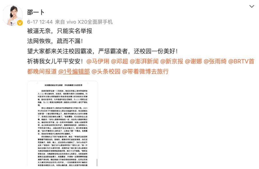 可那些人并没有放过她,最终,这个15岁的姑娘,再也承受不住内心的煎熬,以纵身一跃想了结这噩梦般的花季。而在她住院期间,竟然还有同学称:她怎么没毁容?校园霸凌就像一根刺,让她千疮百孔。在微博热搜榜,#童星邵一卜妈妈发文透露女儿被校园暴力#话题下,已经有超过两千万次阅读量,可见大众对这件事的重视。除邵一卜外,遭遇过类似霸凌经历的明星还有很多。林妙可在“假唱”风波袭来时,被同学指指点点甚至孤立,承受着这个年纪不该有的压力和骂声。