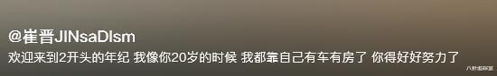 崔晋配文:欢迎来到2开头的年纪,我像你20岁的时候,我都靠自己有车有房了,你得好好努力了“。