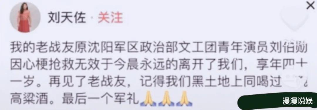 在得知他去世以后,刘天佐在社交平台,发文,再见老战友,更是提醒对方,他们曾经在黑土地上一起喝过一碗高粱酒。