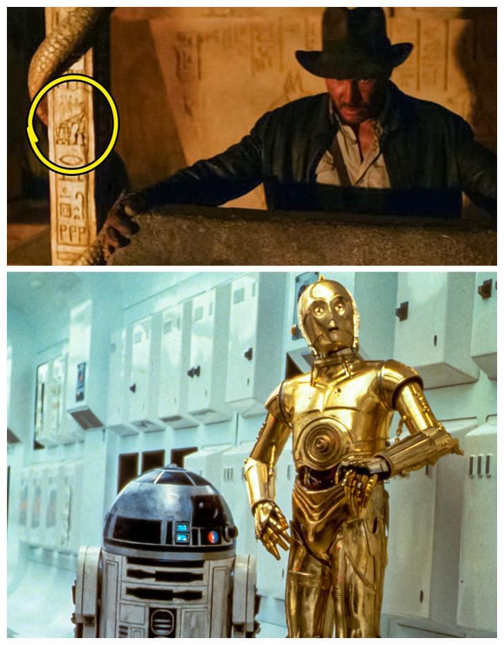 哈里森福特饰演的琼斯抬方舟时,身边有一根带有古代符号的柱子,上面刻有机器人R2-D2和C-3PO的图案,这是对《星球大战》中哈里森福特扮演汉索罗的致敬。《海底总动员》