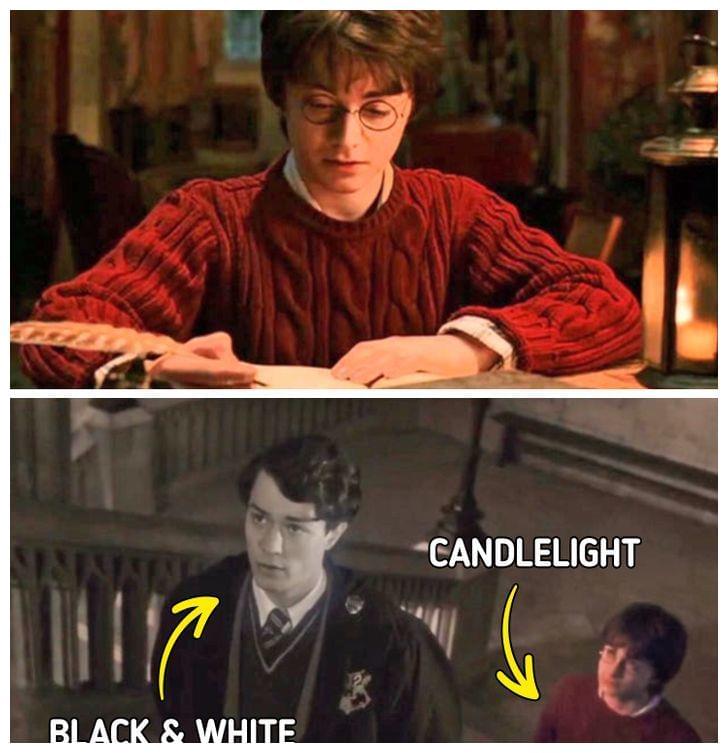 哈利波特进入日记的场景,刚开始他在一个烛光照亮的房间里看日记,后来进入了日记的世界,周围的一切都变成了黑白的,只有他依然被烛光照亮,或许暗示着这一切都是他自己想象出来的。《招魂》