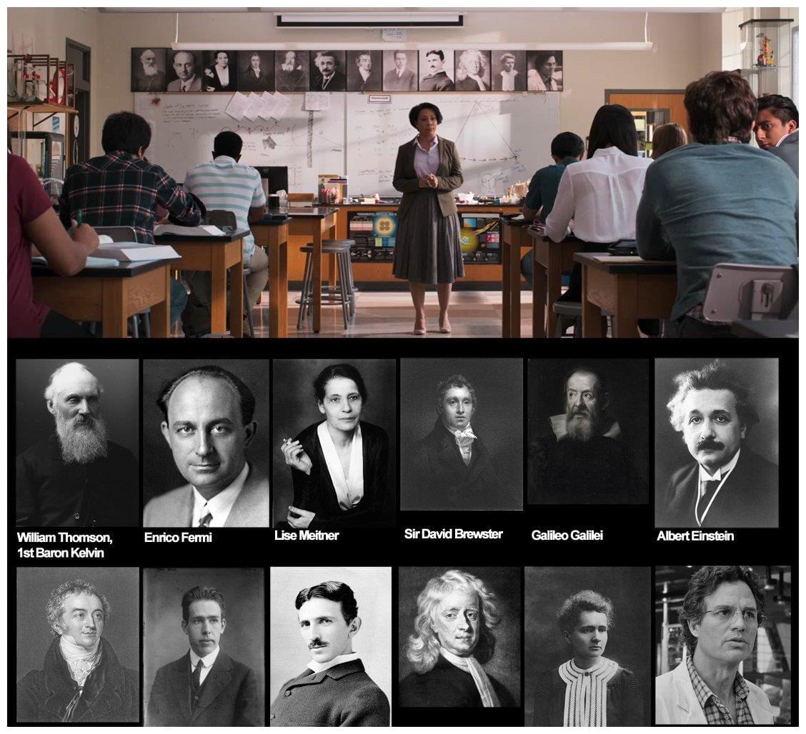 在物理教室的墙上,挂着一排著名科学家的肖像,除了爱因斯坦、特斯拉这些人之外,还有漫威宇宙的科学家布鲁斯·班纳,也就是著名的绿巨人。《盗梦空间》