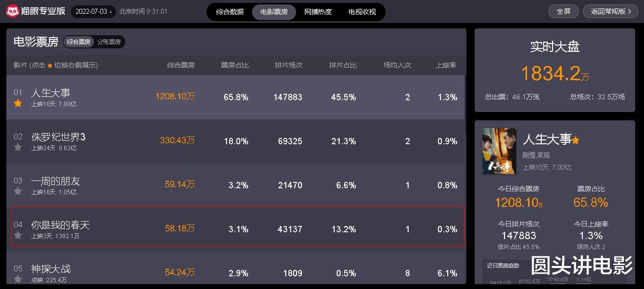 然而,从猫眼专业版实时数据显示来看,该片目前以上映3天时间,累计总票房刚过1千万。而且无论是在影片排片场次还是场均观影人次上,都只能够排在《人生大事》和《侏罗纪世界3》《一周的朋友》后面,这样的票房成绩其实是让人意外的。