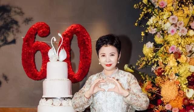 董文华双手比作心形微笑拍照,她一旁是一个纯白色四层生日蛋糕,最上边是两只白天鹅,象征着白洁无暇和优雅。蛋糕后边的背景墙上粘贴着大大的60字样,一看就是用红色鲜花组成,非常鲜艳夺目。