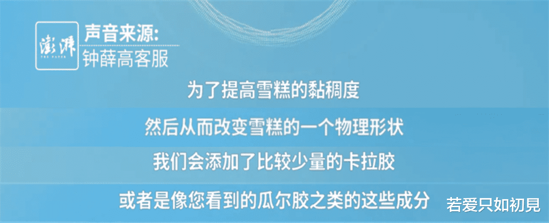 钟薛高的客服在回应这一质疑时表示,被网友测试的那种海盐口味雪糕,除了水、牛奶、椰浆等之外,为提高雪糕的黏稠度,还会添加少量卡拉胶等添加剂,故而融化后会呈现黏糊状。