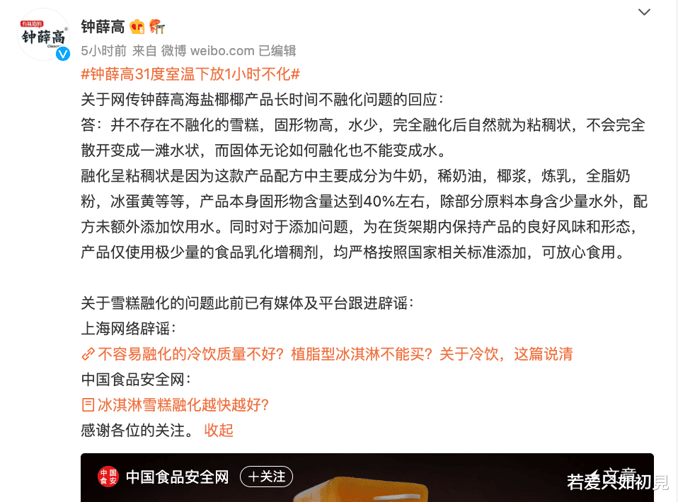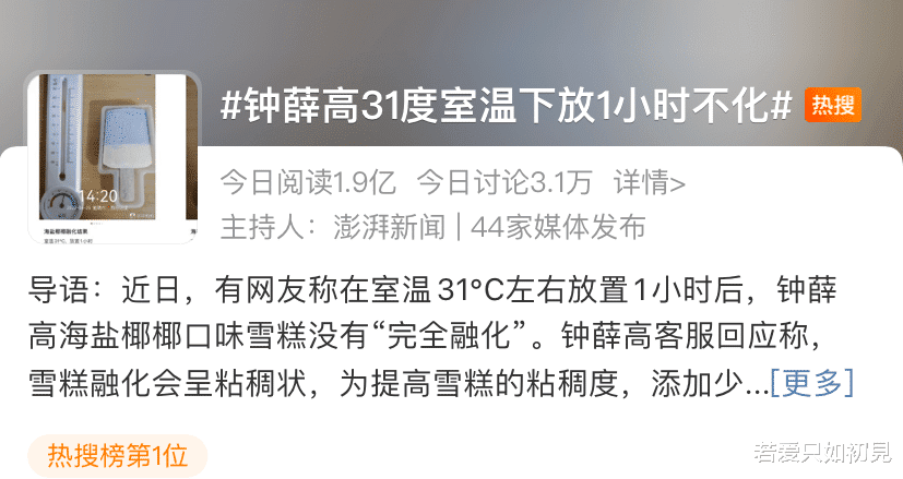 近日,有网友发文称,钟薛高旗下一款海盐口味的雪糕在31℃的室温下放置近1小时后,仍然没有完全融化,引发众多网友质疑:是否因添加剂放得太多牛乳含量不够导致融化缓慢。截至发稿,上述话题已有近5亿次阅读。