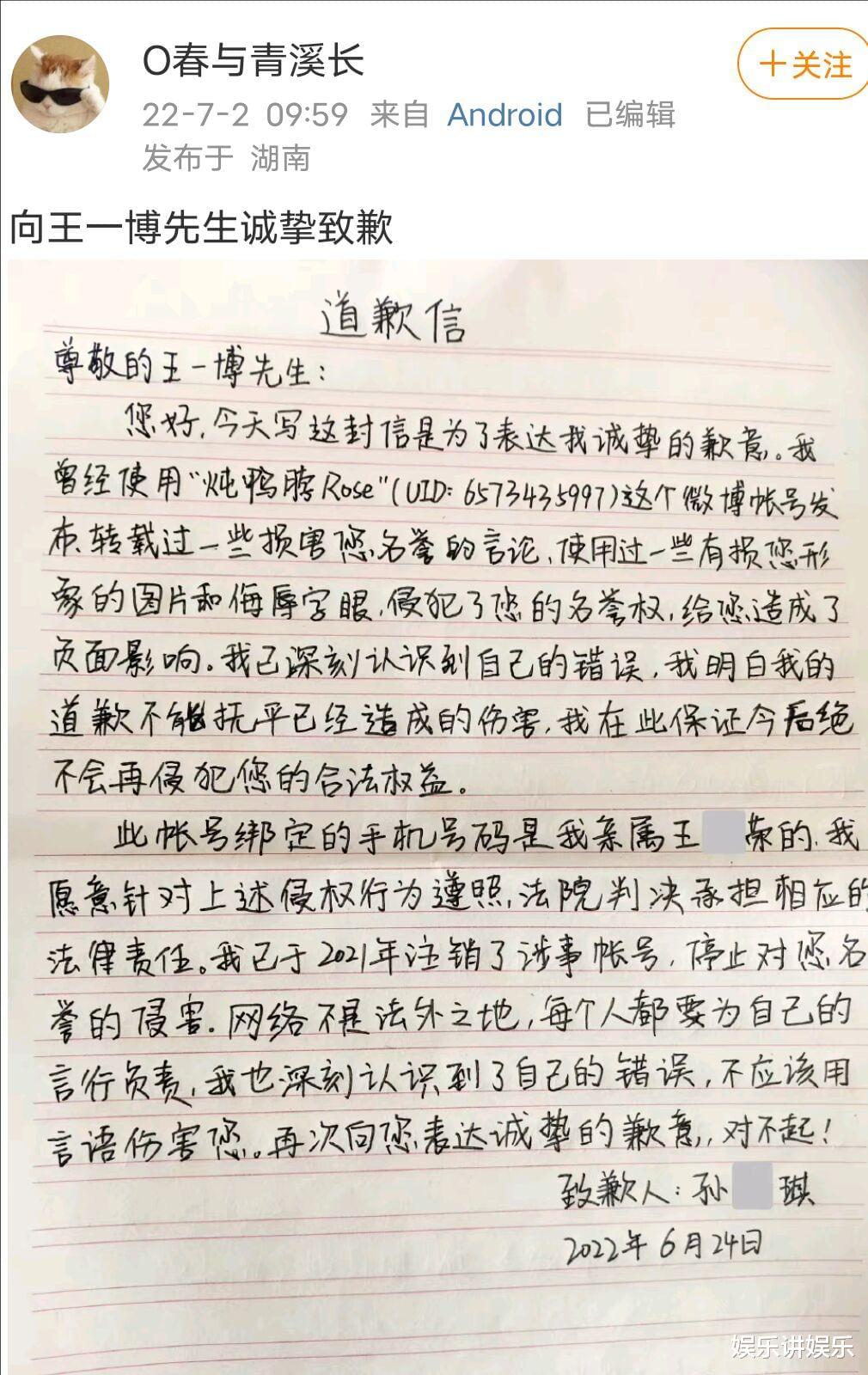 不过,无权之路的确很难,这个黑子对于王一博的造谣、污蔑已经是很久之前的事情了,属于惯黑、职黑,甚至于2021年都注销账号了,这封道歉信才姗姗来迟,这也足以证明维权的不容易,赔偿的三万块钱,王一博此前已经说明会全部用于公益,这也给了黑子不得不给的理由!