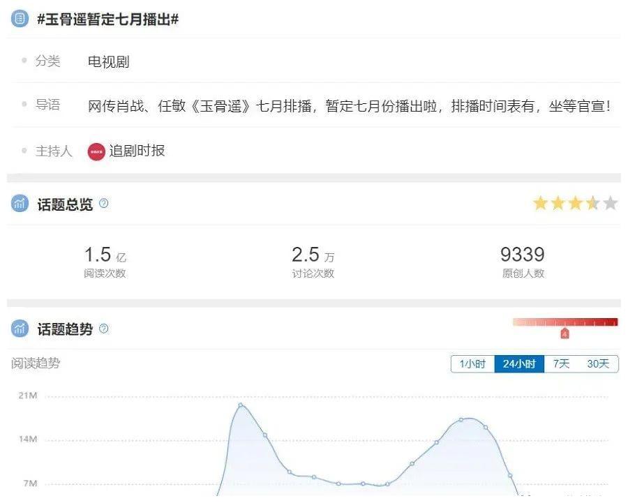 “玉骨遥暂定7月播出”这一话题突然冲上热搜,点开发现阅读量的确不少,短短几小时就破1.5亿次。对于这一网传的消息,还是让不少期待这部作品的观众小小的激动了一下,如果真的是官宣,那就完美了。