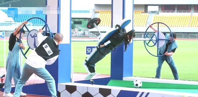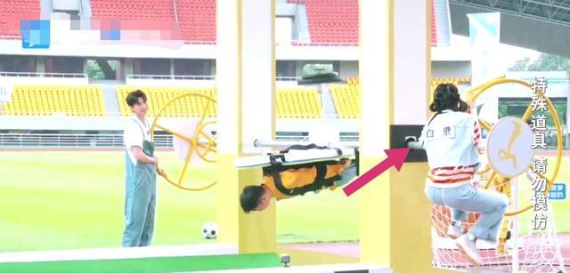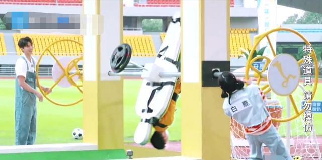 在第一个游戏“人体足球”中,白鹿对杨迪“使坏”了。这个游戏还是个非常费体力的,需要转动轮子控制方向和力度,一个人最轻也有个八九十斤,一轮整下来可真够折腾人的。