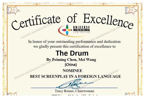 鼓乐非常适合被视觉化,因为鼓乐本身就包含了诸如:动作、画面、音乐、节奏等等影视作品所需要的元素。如果有好看的鼓乐元素,再加上一个好故事,就会成为一个很棒的影视作品。而陈霈铭的剧本《鼓》,正是这样一个好看的电影作品。电影剧本《鼓》不但入围了2022年世界民族电影节,并喜获最佳外语长片剧本提名奖。