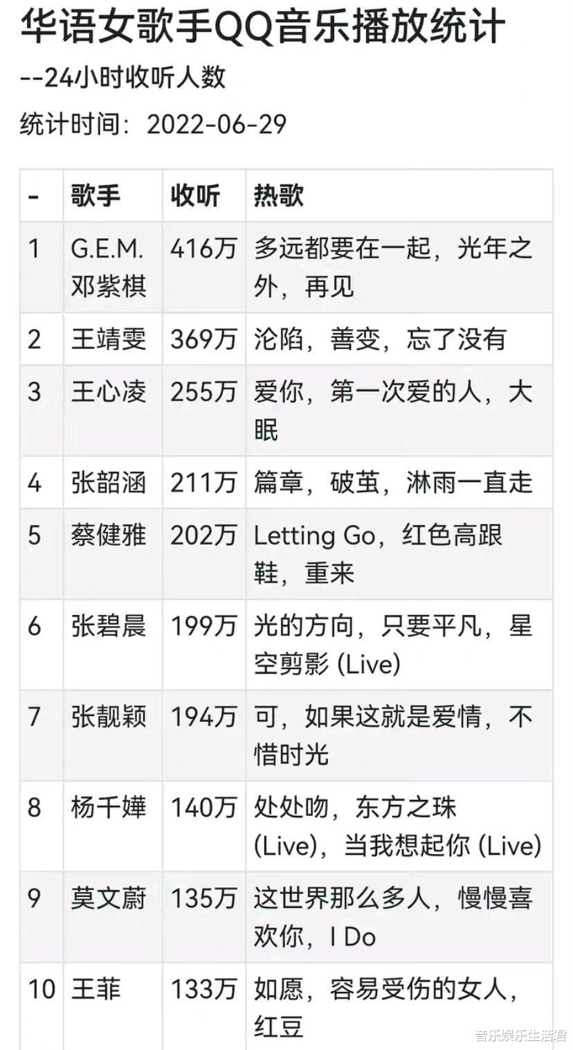 第一名邓紫棋,她的播放数据也是女歌手中一直霸榜的,但是也没超过男歌手的第四名薛之谦。